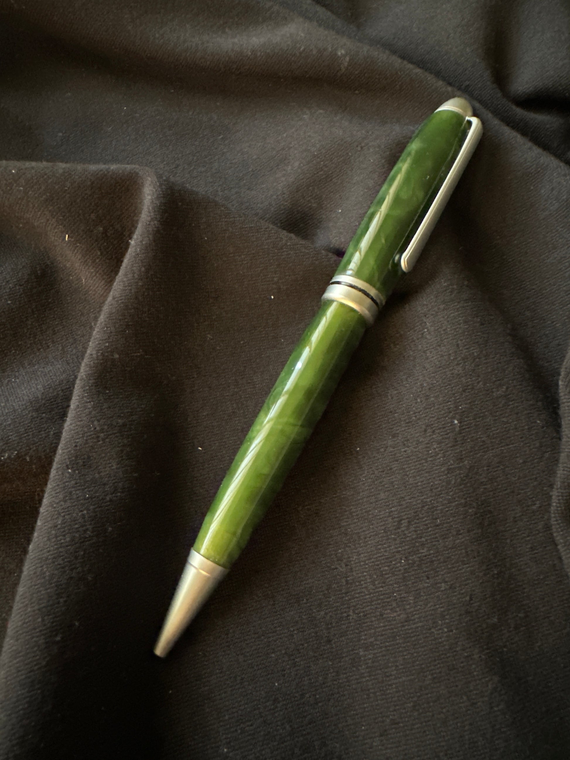 The Designer Twist Pen is a sturdy twist ball point pen for everyday use. Shown here in an emerald green acrylic with satin pearl hardware, it is also available in gold, copper, gun metal, or chrome hardware, and is approximately 11mm in diameter at the "finger grip" location, about 1.5 inches (4 cm) from the point of the pen. Add it to your collection or give it away as a gift. They are refillable, so don't forget to purchase additional pen refills before you checkout. We also have gift box options to make gifting easier.