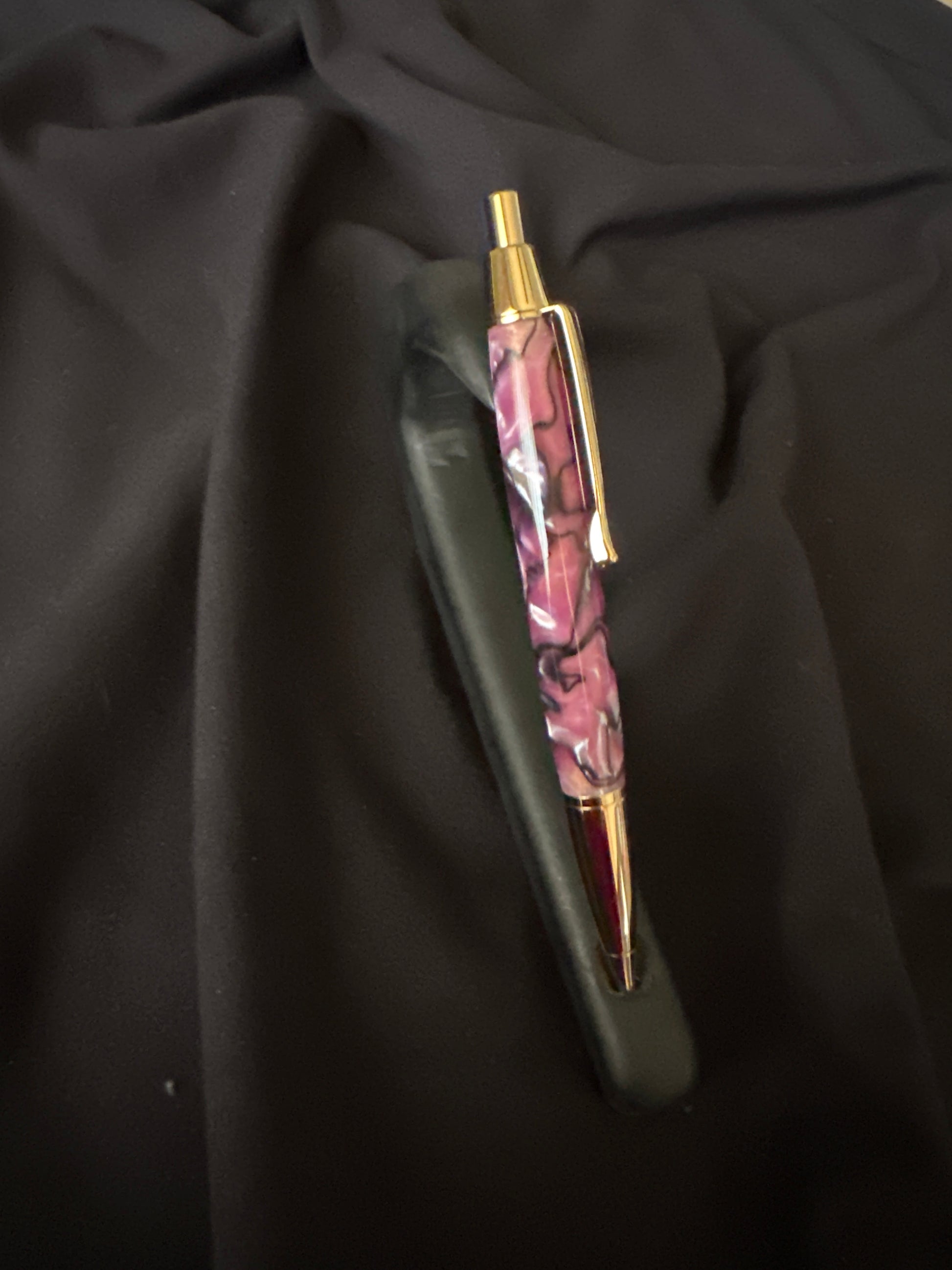Our Devin Click Pen is a favorite in the click pen family! This purple and silver swirl acrylic is accented with 24kt gold hardware. It's available in gun metal or a 24kt gold/gun metal combination. It is 12-13mm in diameter at the "finger grip" location, about 1.5 inches (4 cm) from the point of the pen. Add it to your collection or give it away as a gift. They are refillable, so don't forget to purchase additional pen refills before you checkout. We also have gift box options to make gifting easier.