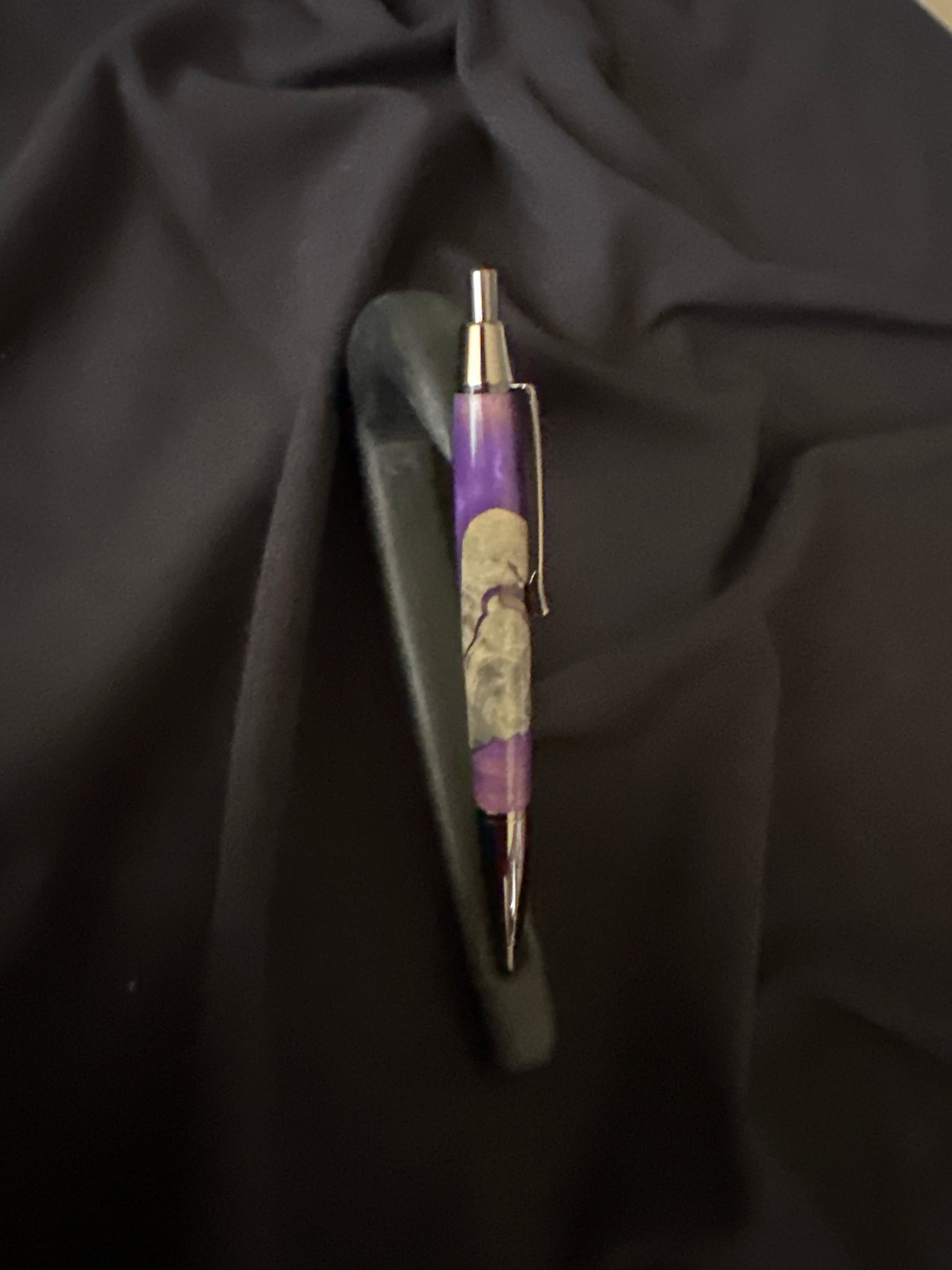 Our Devin Click Pen is a favorite in the click pen family! This purple burl is accented with gun metal hardware. It's available in 24kt gold or a 24kt gold/gun metal combination. It is 12-13mm in diameter at the "finger grip" location, about 1.5 inches (4 cm) from the point of the pen. Add it to your collection or give it away as a gift. They are refillable, so don't forget to purchase additional pen refills before you checkout. We also have gift box options to make gifting easier.